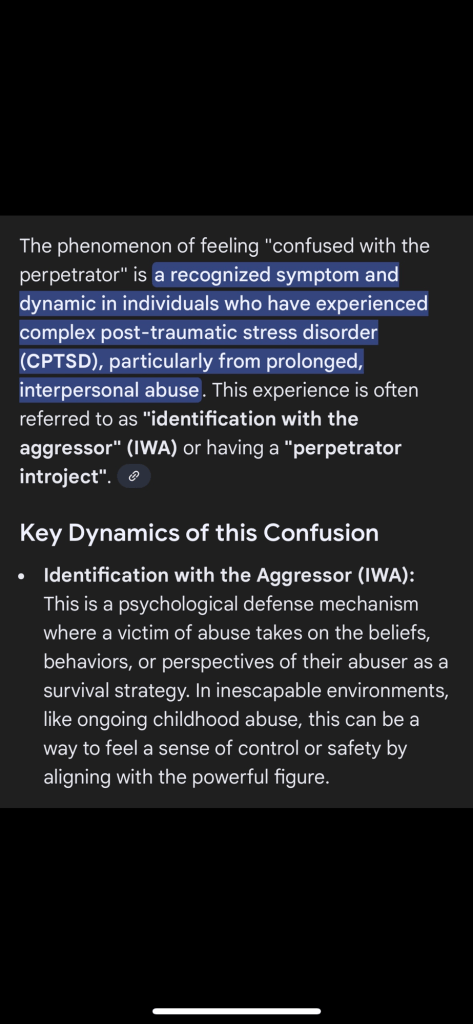 During a crisis you get confused about the perpetrator. Especially if there has been more than one. Life was more peaceful when the dissociative amnesia blanked that all out.