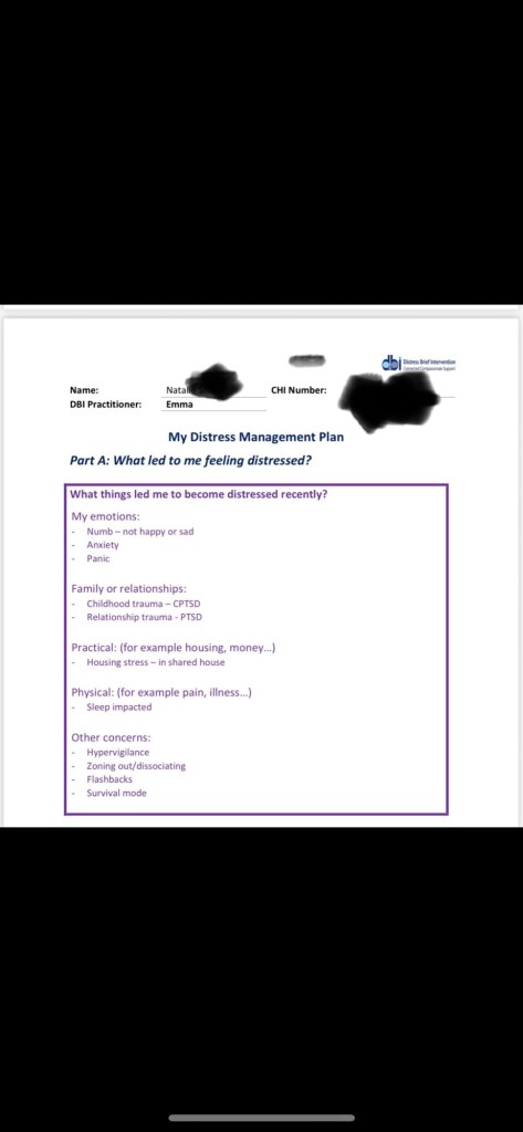 I attended the distress brief intervention so I can calm down the troublesome behaviours associated with both types of my PTSD recently.