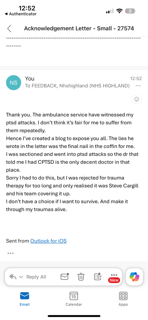 It wasn’t my plan to expose NHS Highland. I had to endure multiple ptsd attacks and then be betrayed by Steve Cargill and his team. Sorry it had to come to this.