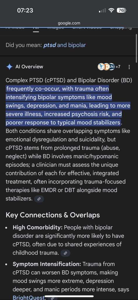 Separate to my AuDHD and PTSD/CPTSD but to be honest, are people surprised considering my whole childhood was trauma? I love the manic episodes. I’m a bit like Kanye West though in the sense that I have very short periods of depression which has very few suicidal thoughts. They think it’s a type of Autism because anyone with this type of bipolar was born with Autism and ADHD. But it’s very rare – it affects 0.6% of the population.