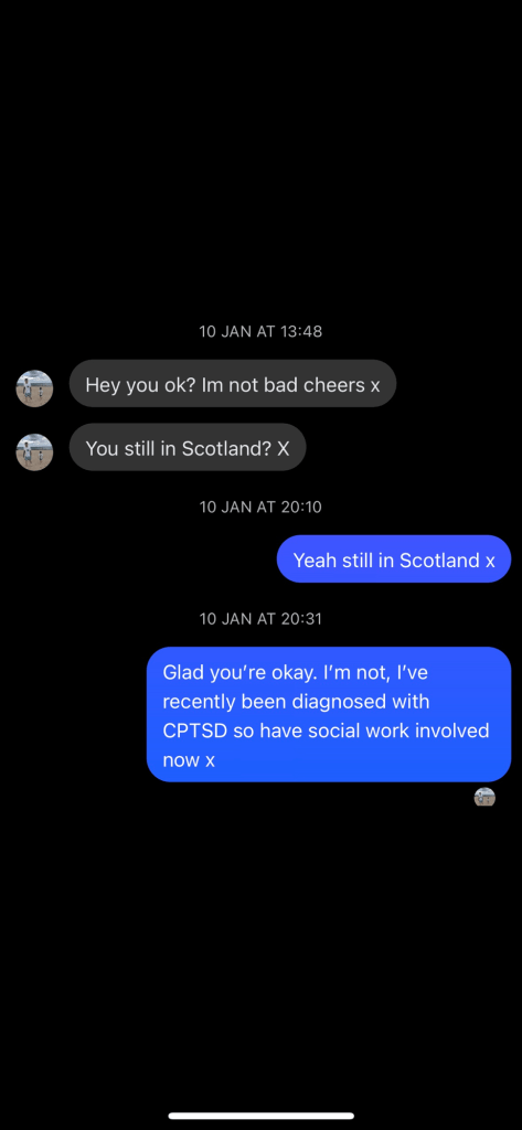 Third time lucky. I’ll ask my ex if he knows anyone. It’s the only way isn’t it? I’ll just do a written letter to say I won’t get them done. It’s a last resort because my month and months long crisis episodes aren’t triggered that easily so I just need a man to beat the hell out of me. Because they’re not going to see it on my face. PTSD you can barely see sometimes. I have to go swinging from a high to a low again.
