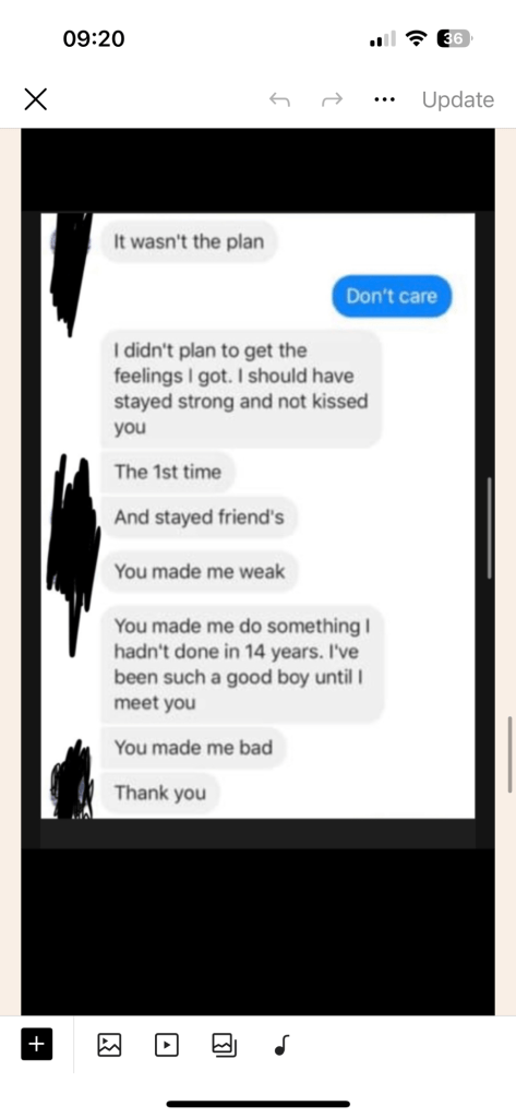 Anyway, one day he switched. Suddenly. I already had relationship ptsd in the sense that I was more stable alone because relationships would flare up my symptoms. So I took a chance with him. He invited his son round to meet me. Buy me gifts, wheel me in. He was in the army, so I trusted him. But he also told me he was single and he wasn’t. He was married.