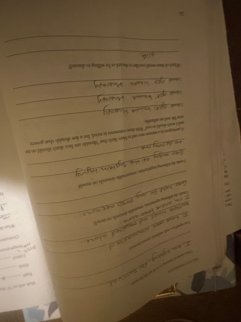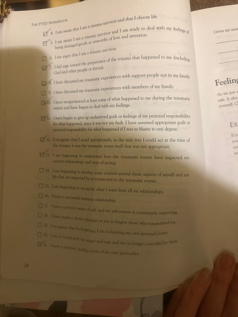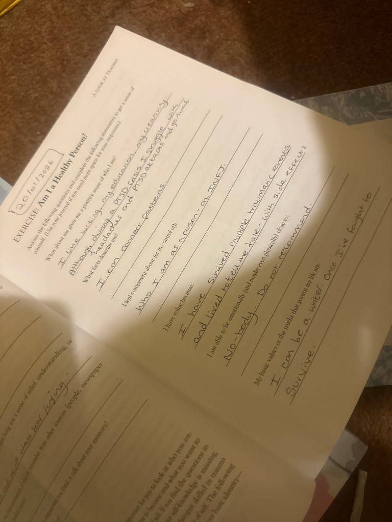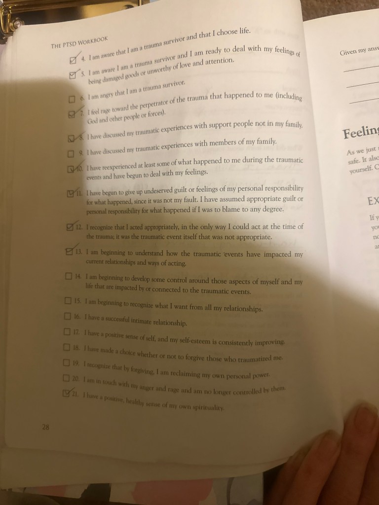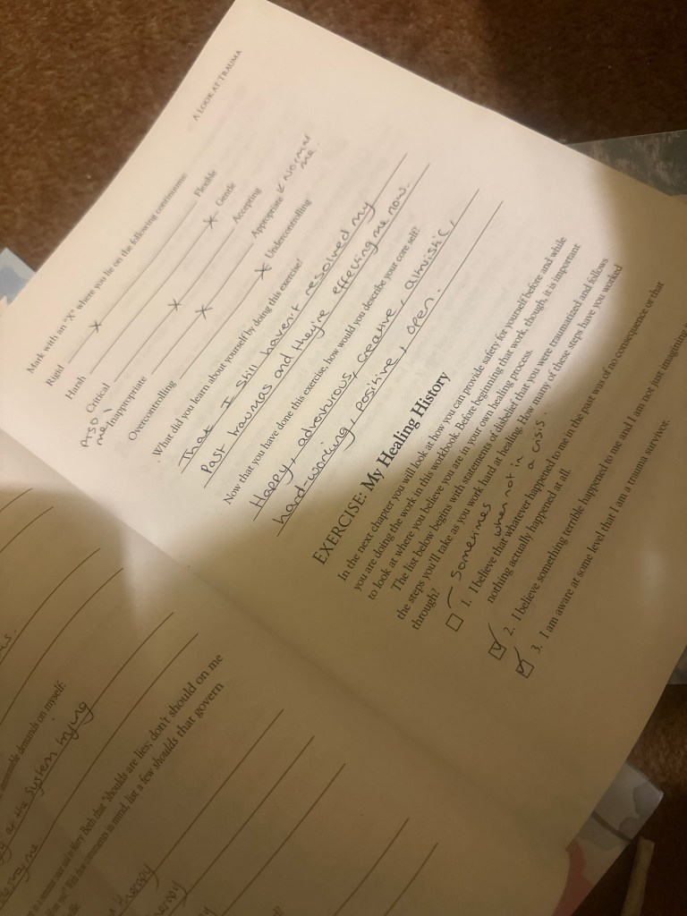 This is traumatising to do alone, but if I’m going to heal I need to face it. PTSD workbook ❤️ I have to keep re-triggering myself daily to try and fight it.