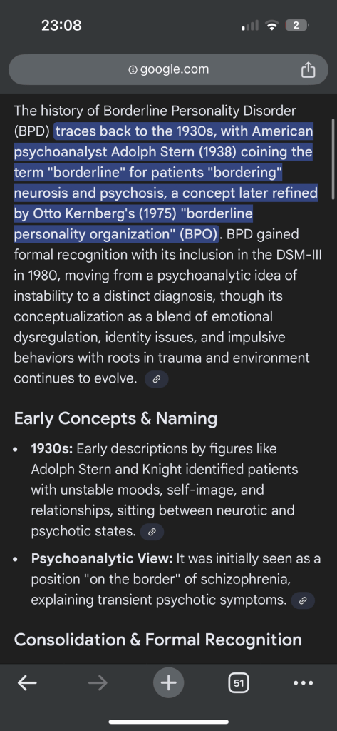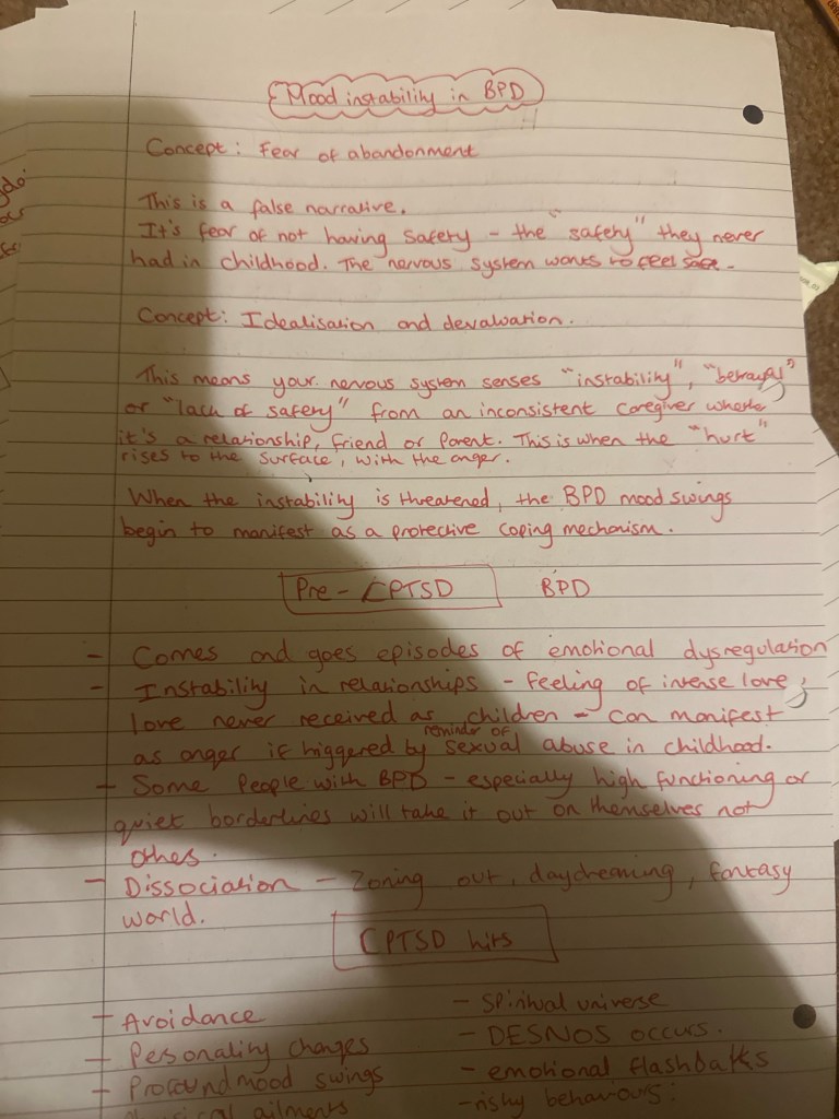 Unless you get symptoms that resemble schizophrenia, like in the 1938 term for BPD, you don’t have it. It’s not pervasive well it is, but it comes and goes because it’s dissociative PTSD. That’s why I’m laughing so much. I’m like, well the system messed that one up by rejecting neurodivergence in the first place. And now the government is probably thinking “yes Natalie, we know we made a mistake with the labels, but will you keep your mouth shut because we don’t have the money to fix it”. Okay, can I have compensation for distress to pay for my trauma therapy then.