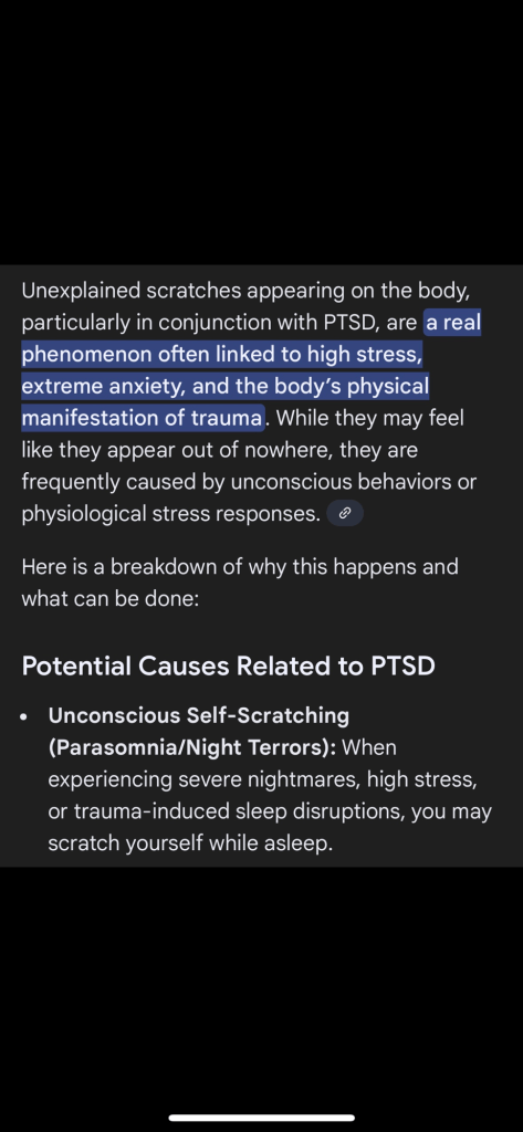 Well if I can’t prove the PTSD, my back looks like it’s been attacked so that will prove it. And it’s scratched to fuck in places I can’t even reach. Just saying.