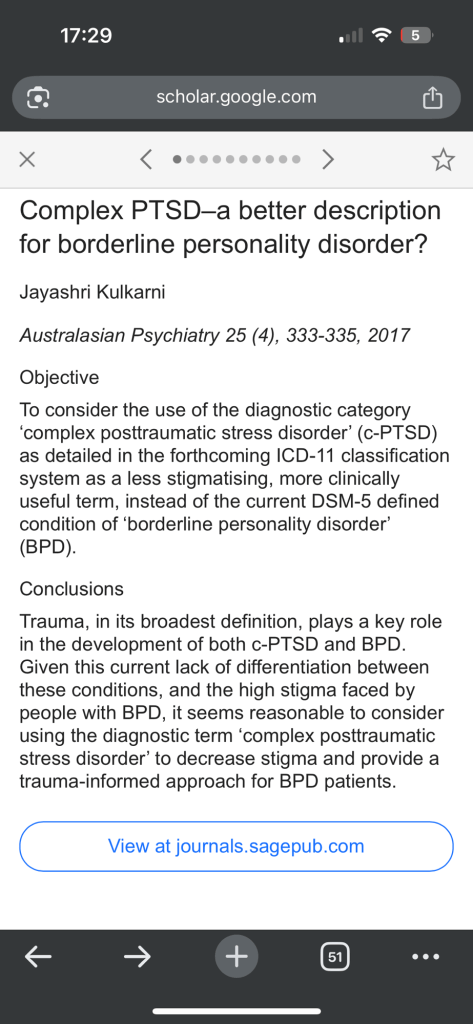 So it’s a label to define what appears to be a “borderline” with PTSD symptoms. But it’s not BPD. Because BPD is PTSD which is why it looks similar. My recent ex with BPD who we met a few weeks ago after I moved out of my mums has got worse and lost his mind when his mother passed. No doctor wants to help him. He wants me to help him but I can’t go near him. Because of our history. That’s my issue not his. My hands twitch and I’m in fear thinking back to him. We stayed together too long. Prolonged trauma right? I just got unlucky in life.